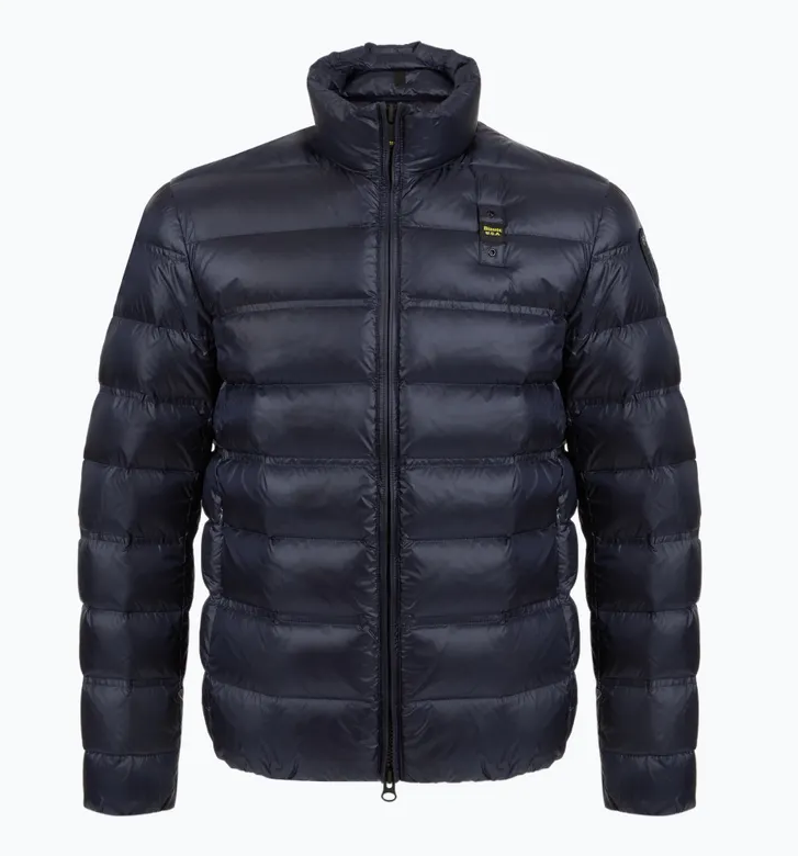 A glossy quilted down jacket with interspersed single and double horizontal stripes. An iconic Blauer piece with natural down padding, warm and lightweight