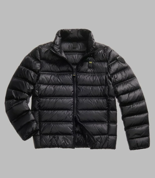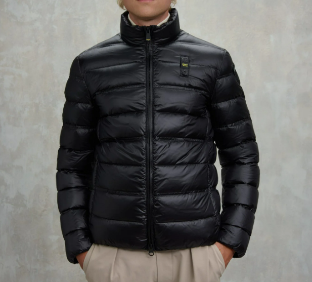 A glossy quilted down jacket with interspersed single and double horizontal stripes. An iconic Blauer piece with natural down padding, warm and lightweight