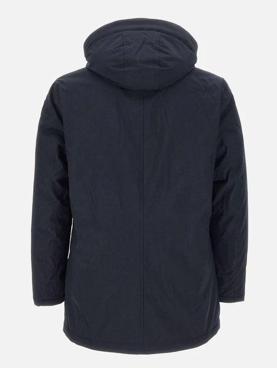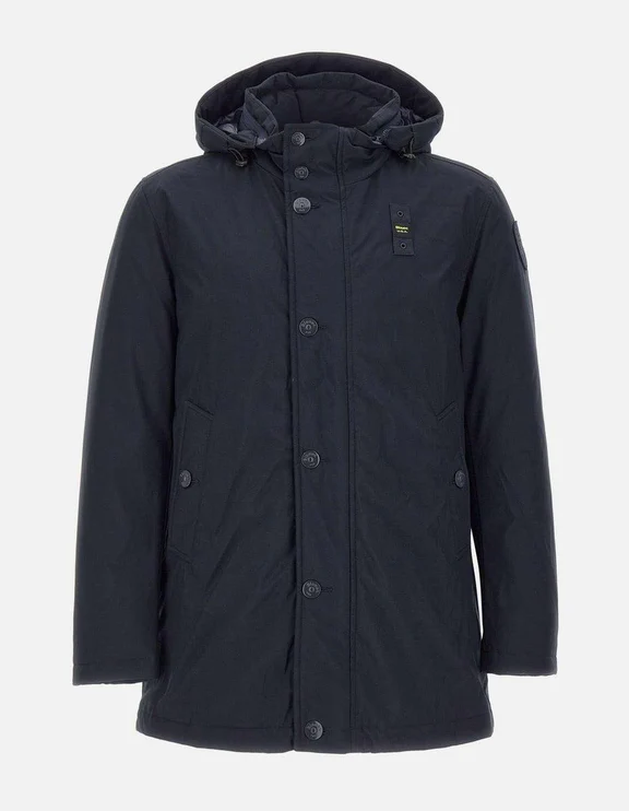 Long parka in smooth, water-repellent neoprene with a zip-off high collar. Warm yet unobtrusive natural padding. An iconic Blauer piece with military inspiration.