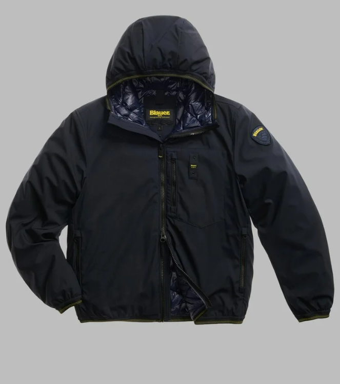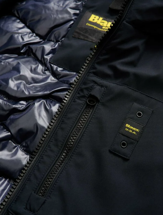 Water-repellent, monochrome down jacket with a horizontal wave quilting. The down jacket features a left chest pocket with a vertical zip.