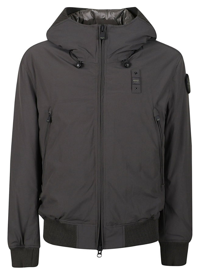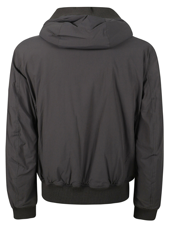 Technical fabric jacket with ribbed elastic cuffs. Fixed drawstring hood, zip closure, nylon lining, Sorona® Aura wadding, zip pockets, internal Velcro pocket, Velcro logo patch, and logo loop.