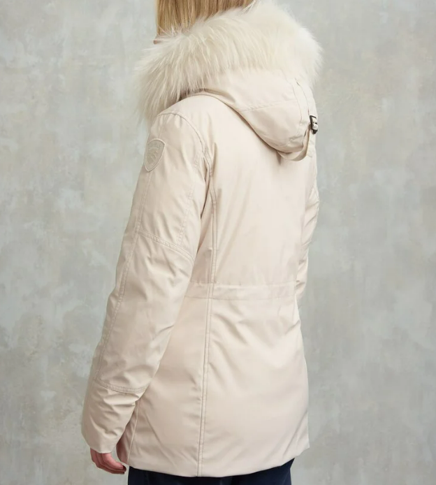Timeless parka made of neoprene with taslan details. This feminine piece can be tailored even more tightly with the drawstring waist.