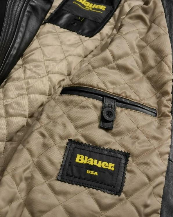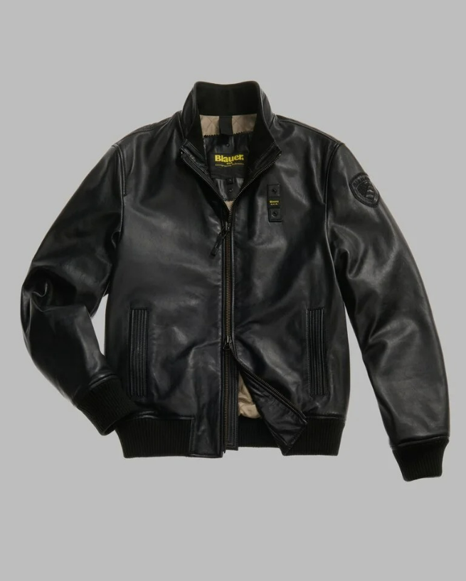 Leather bomber jacket with a lightweight lining. Elastic ribbed inserts on the inner collar, cuffs, and hem for a snug fit.