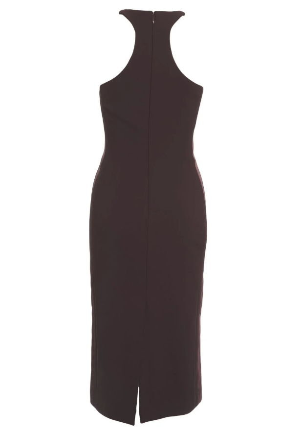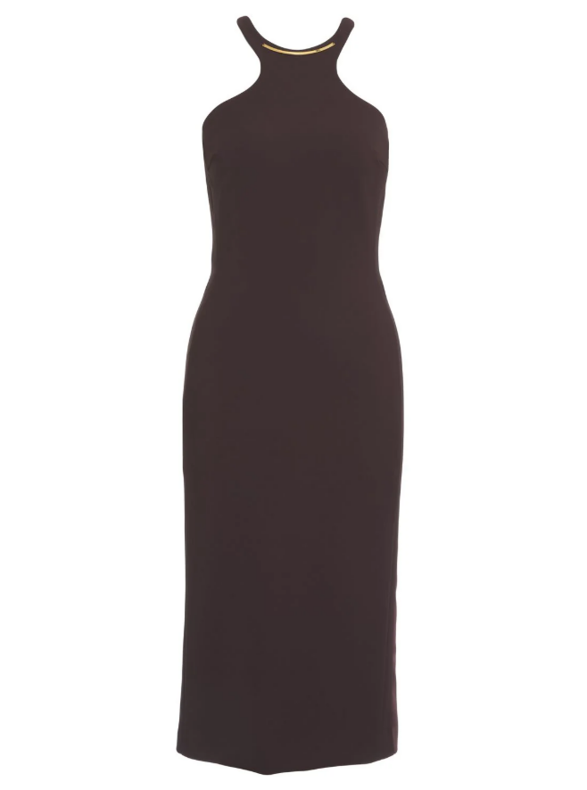 Lightweight crepe dress with a fitted fit. The dress features a midi skirt and a racerback neckline that highlights the shoulders. A gold metal logo plaque embellishes the neckline.
