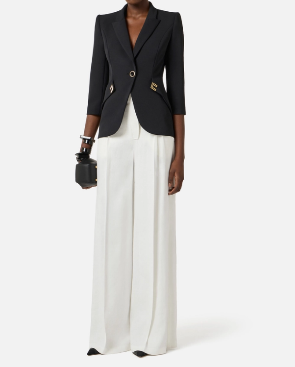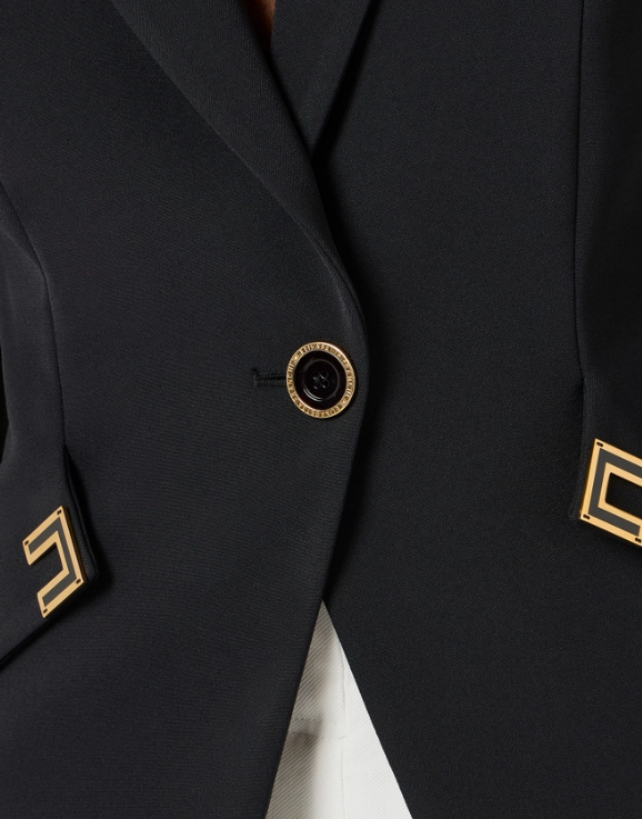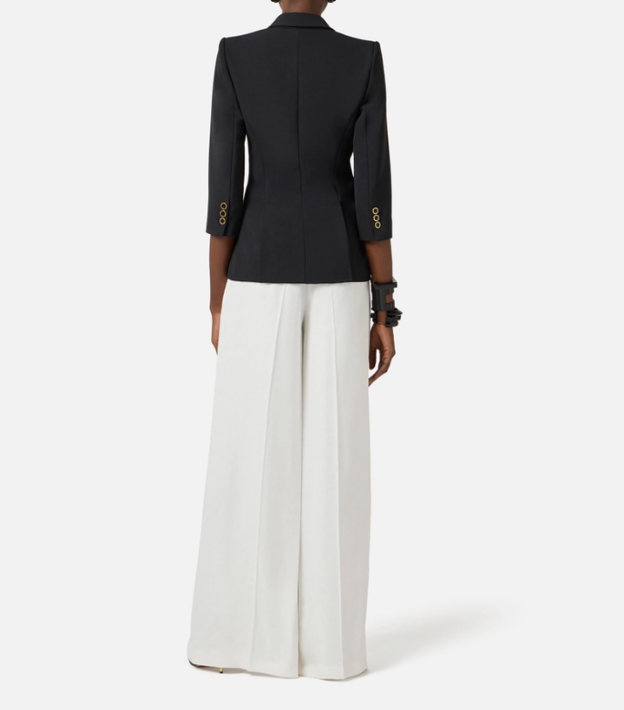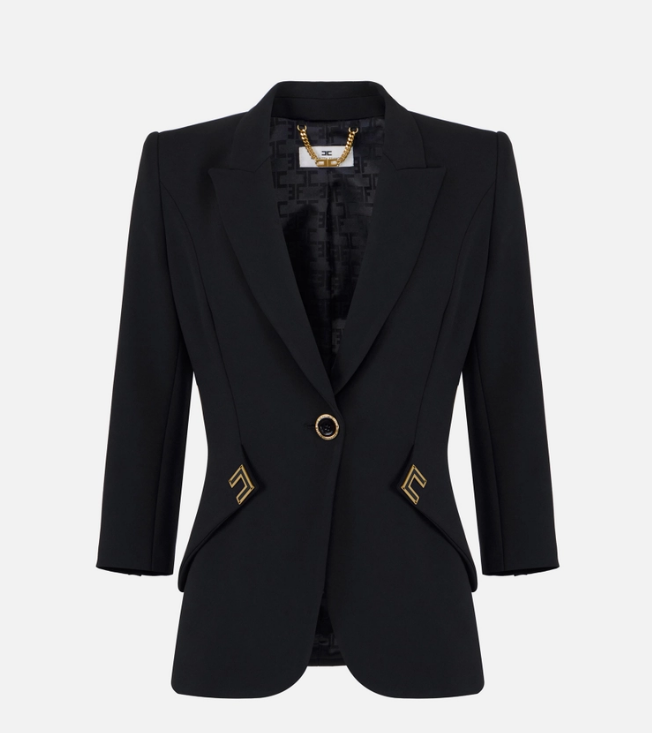 Jacket in double layer stretch crêpe with structured shoulders, peak lapels and ¾ length sleeves. The blazer features diagonal cuts on the sides, embellished with golden metal logo details enamelled on the inside. Slim fit.