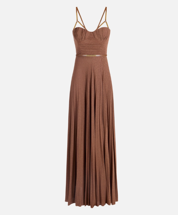 Fitted lamé jersey evening dress. The dress features thin metal shoulder straps with dazzling geometric patterns, while details like bustier cups and side slits enhance the garment's sensuality. The gold-tone metal plaque belt adds the finishing touch.