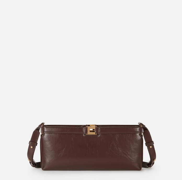 Bag made of synthetic material with a naplak-effect texture. With an adjustable shoulder strap, it features a gold-tone metal detail with a logo embellishment