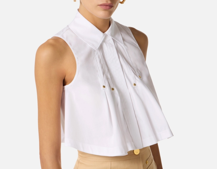 Sleeveless cotton poplin shirt with a high collar. It features pleated detailing on the front, embellished with gold-tone rivets. The back is accented with a half-belt with logo detail. Regular fit.