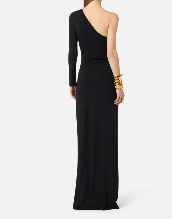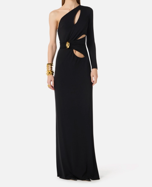 Fitted crepe jersey evening dress. The one-shoulder design features long sleeves. It stands out for its cut-outs held in place by a dazzling jeweled tie with an organic shape and texture. The deep side slit skirt adds a bold finishing touch