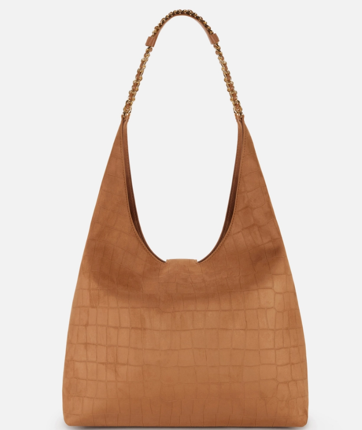 Hobo bag made of suede with a crocodile print texture. Its handles are embellished with intertwined gold-tone metal chains. The closure is highlighted by a logo plaque