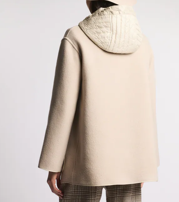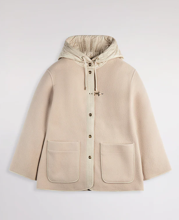 Bi-material pea coat made of wool and cashmere, with a hood and patch pockets. This unlined style features a quilted nylon hood and details. The garment is completed by a personalized snap closure and the iconic Fay hook.