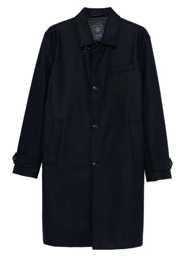 The design is completed by a custom button closure and the iconic hook at the collar.