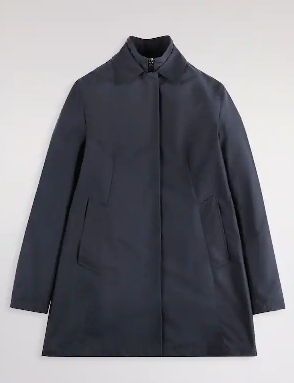 Semi-lined, double-front morning coat made of technical poplin with a water-repellent treatment. Featuring a zip and hidden snap closure, it features front pleats and side pockets. The style is embellished with Fay embroidery on the undercollar.