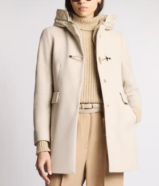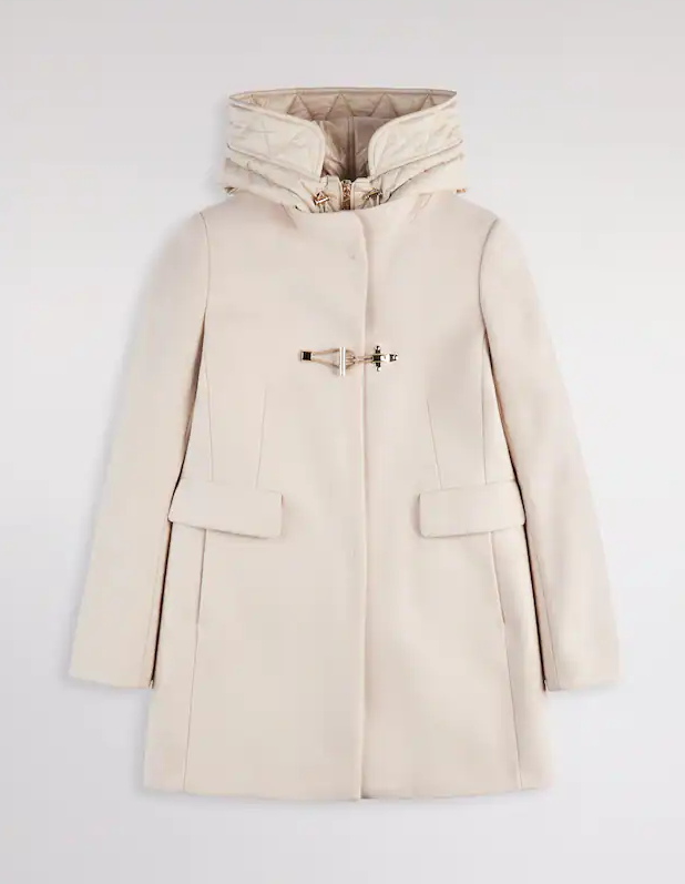Made of a soft wool blend, with a padded bib and hood, it features a zip closure, hidden snaps, and a Fay toggle. It features an internal label with the garment's name.
