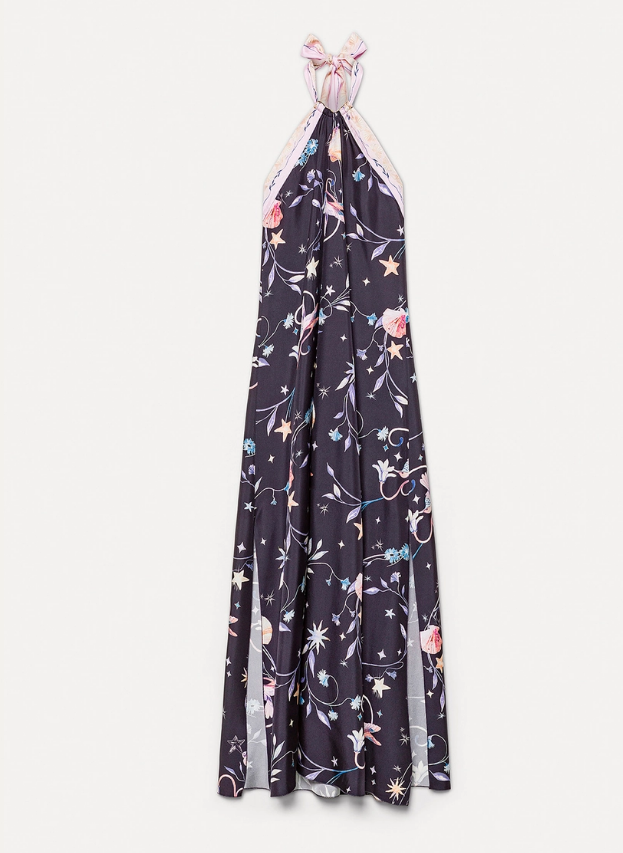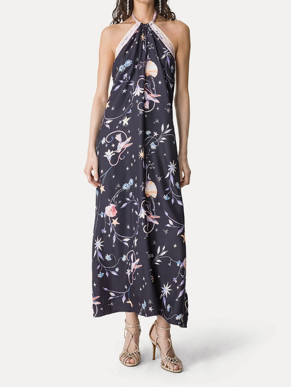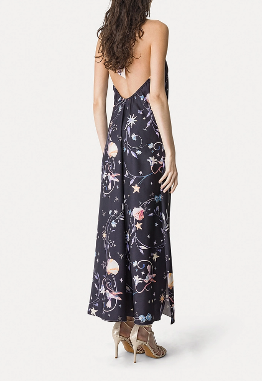 With its halterneck decorated with embroidered beads, this long and elegant dress with a "delivery" print is an ode to femininity. Fluid and silky, it glides over the figure, decorated with a playful array of flowers, shells, and starfish