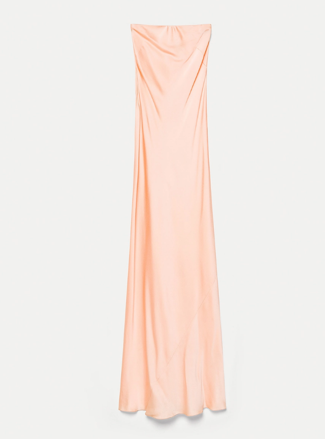 Long dress in reverse satin. The straight neckline and deep slit create bold geometric designs, ideal for romantic evenings or the season's coolest parties