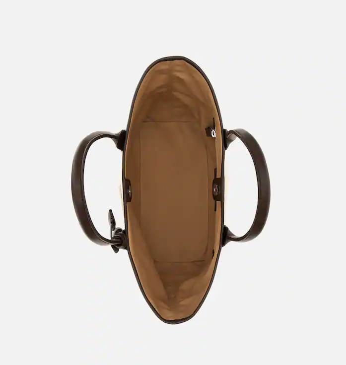 The signature shopping bag featuring the brand's address is offered in a lightweight, summery version. Featuring an embossed logo, this canvas version features two fixed leather handles and a spacious compartment with a magnetic snap closure. A keychain pendant and metal H-Fob charm complete the look.
