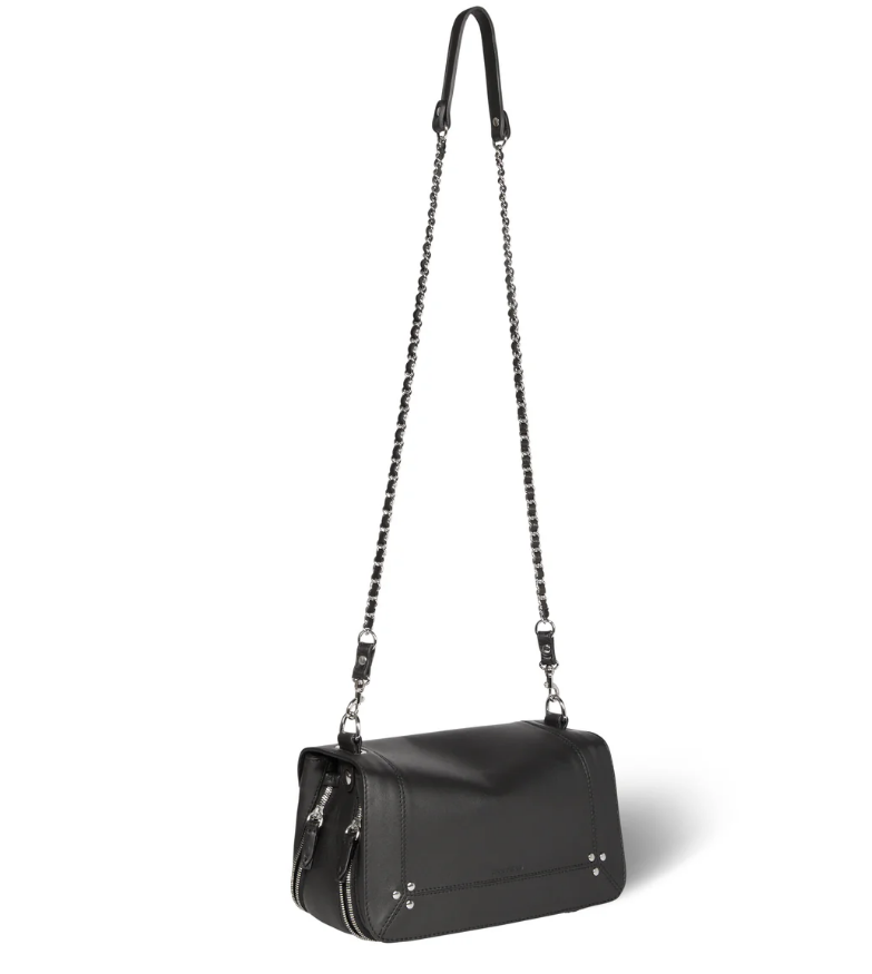 Leather and chain shoulder strap adjustable and two lengths : 65 cm or 105 cm. Leather flap with a double magnetic fastening. Three pouch compartments. Two zip gussets to adjust size. One detachable mirror and key hook inside. Can be associated with all our shoulder straps and handles