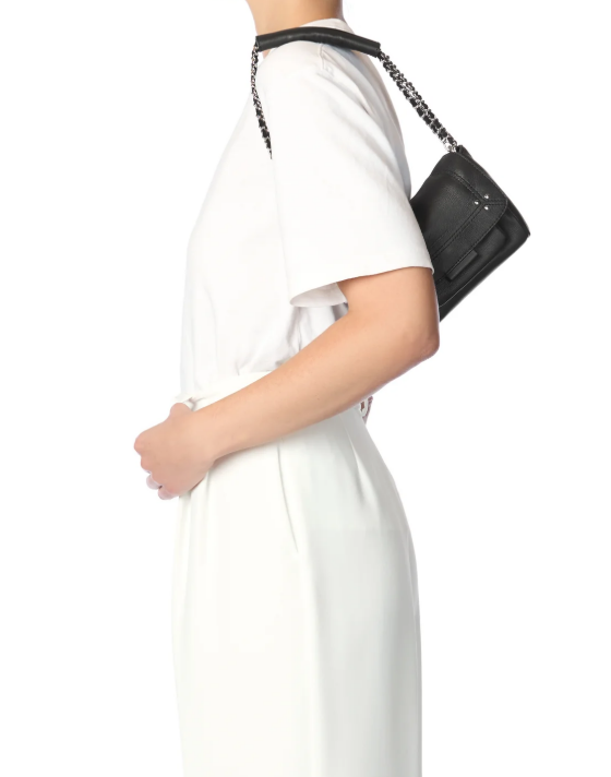 A removable and adjustable leather and chain shoulder strap in two lengths; measuring maximum 105 cm and minimum 52.5 cm, with a large leather tabs with pressure. Flap with magnetic closure. Organized bag with a large compartment and a pocket. A small pocket under the flap. One key hook inside.