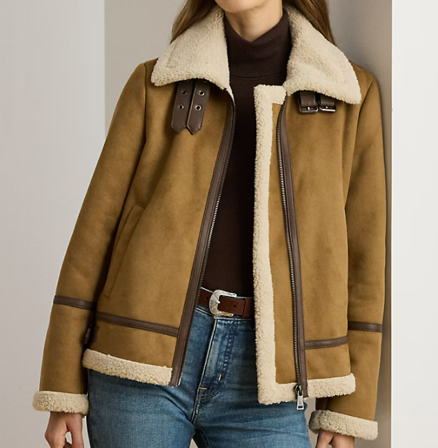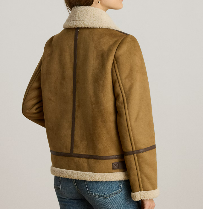 Crafted from a combination of faux suede and shearling, this luxurious jacket features a collar that can be worn as a soft, wide collar or a practical funnel collar, offering multiple looks in one piece. Two sumptuous faux leather buckle closures at the throat add a casual yet refined touch