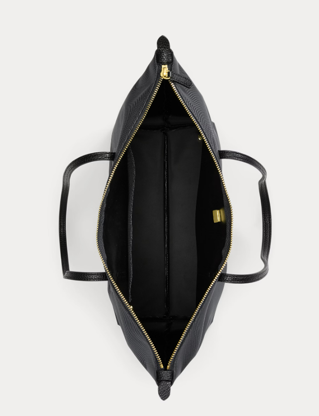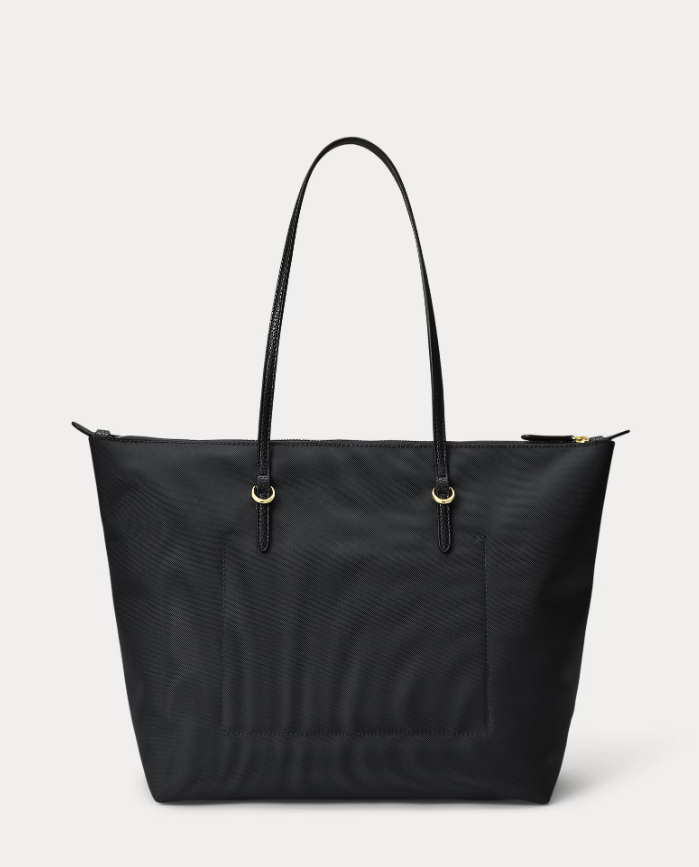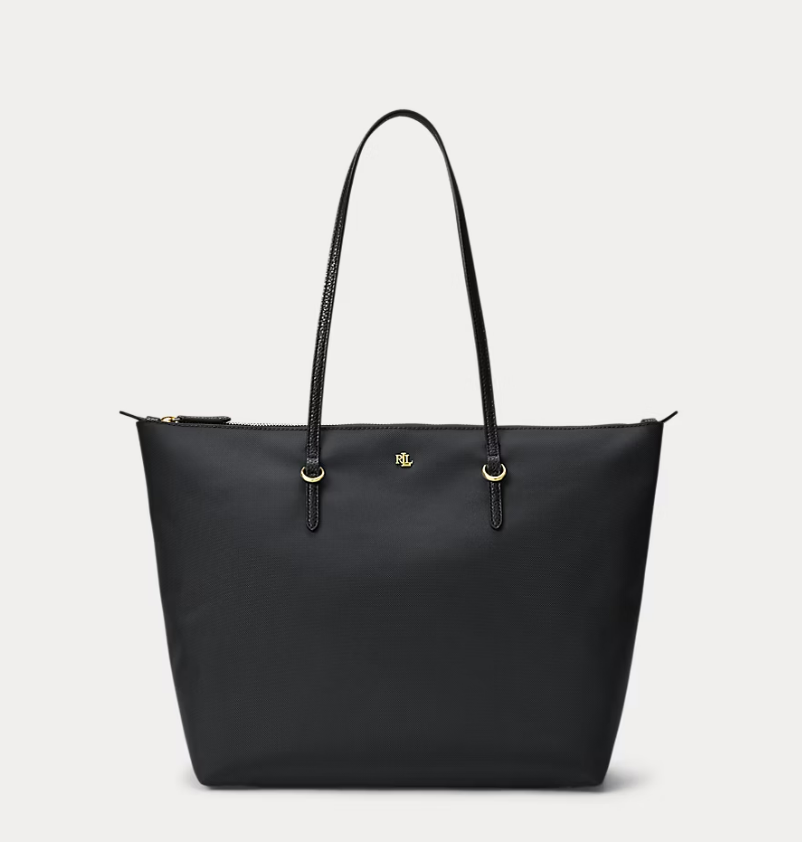 Featuring a durable nylon exterior and luxurious faux leather handles, the Keaton Large Tote offers a spacious silhouette, perfect for carrying everyday essentials. This versatile style is accented with polished "LRL" hardware on the front for a unique touch