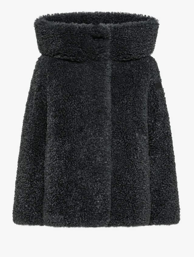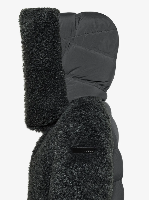 This versatile and distinctive outerwear piece stands out for its distinctive silhouette and the original construction of the front and sleeves, embellished with warm and enveloping faux teddy fur. The back features tubular channels containing the soft, warm duck down padding, offering exceptional comfort and lightness.