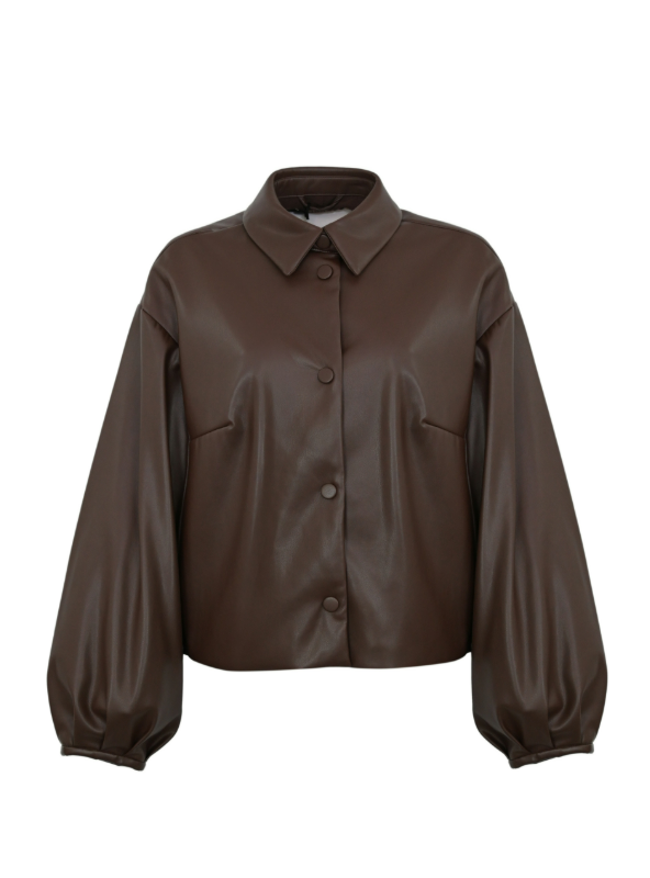 Leather-look jacket with shirt collar, covered snap button fastening, long soft balloon sleeves with gathered detailing, lining, straight fit.
