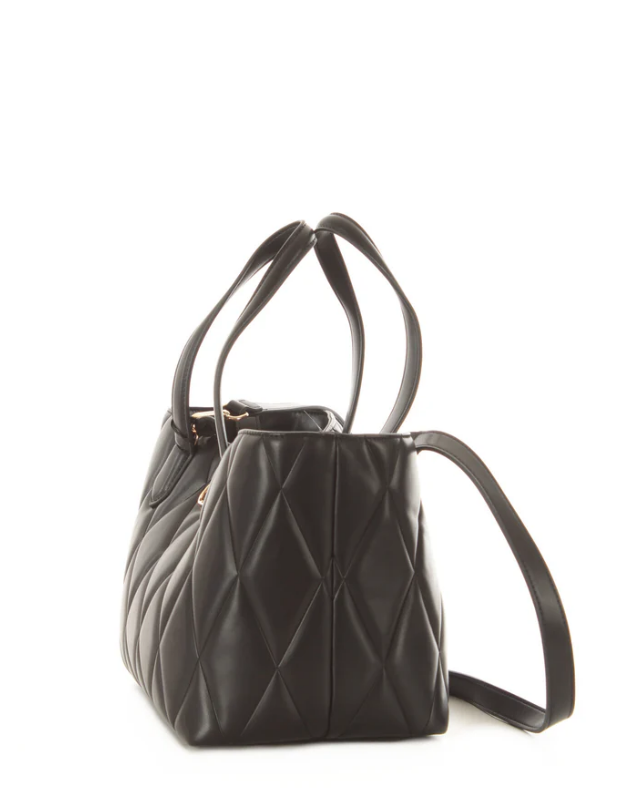 Faux leather tote bag with quilting. Double handles, removable shoulder strap, and magnetic and clip closure