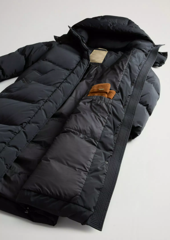 Wind-resistant and water-repellent, it's padded with duck down and finished with horizontal quilting to maximize warmth. It features functional details such as a removable, drawstring-adjustable hood, a high collar with snaps for added protection from the cold, and practical pockets: two side welt pockets and one inside. A concealed zip and snap closure completes the clean design, while ribbed cuffs and side zip openings ensure an optimal fit