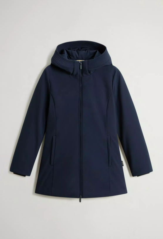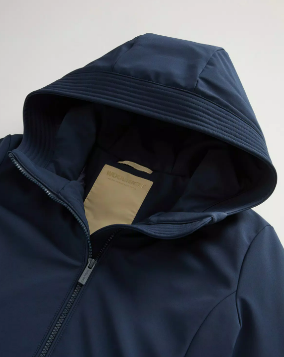 Made from Tech Softshell, a water-resistant and windproof fabric, it's insulated with duck down and features a chevron quilting interior. It features a hood and high collar for optimal protection, welt pockets, a convenient internal zip pocket, ribbed cuffs, and a side label.