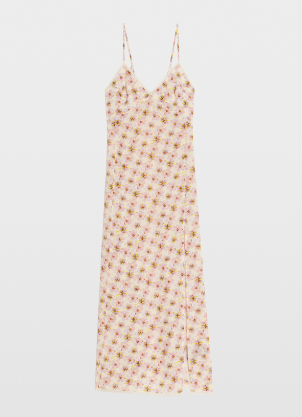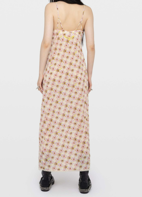 Lingerie-style long dress in printed viscose, with slit, adjustable straps, embroidered back wings and lace