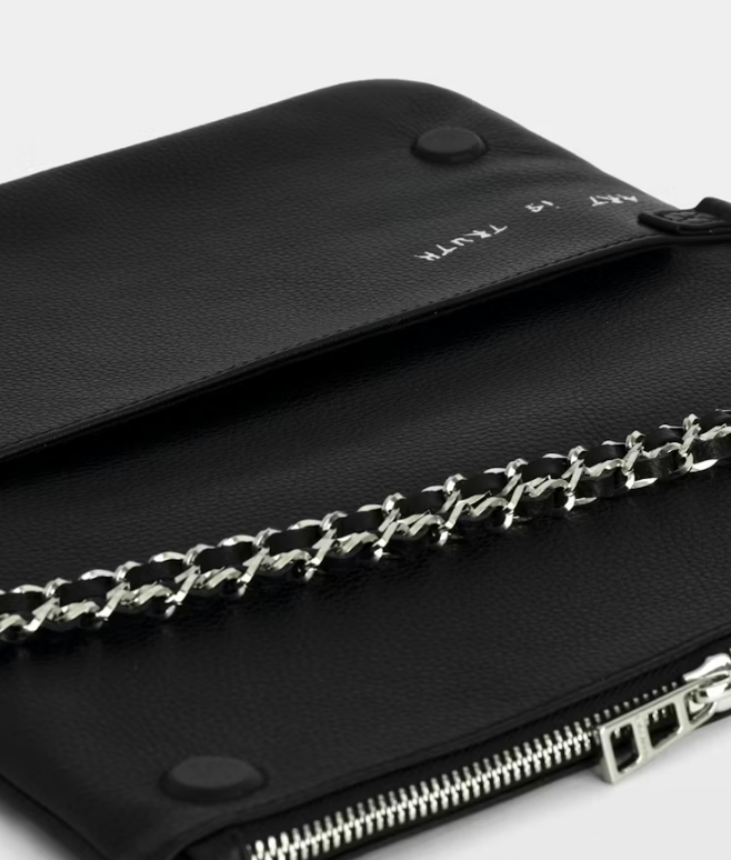 Grained leather clutch bag with Graffiti print, double chain in leather and metal and wings adorned with rhinestones