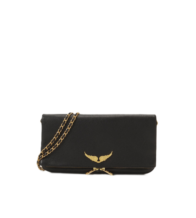 Grained leather clutch with double leather and metal chains and rhinestone-adorned wings