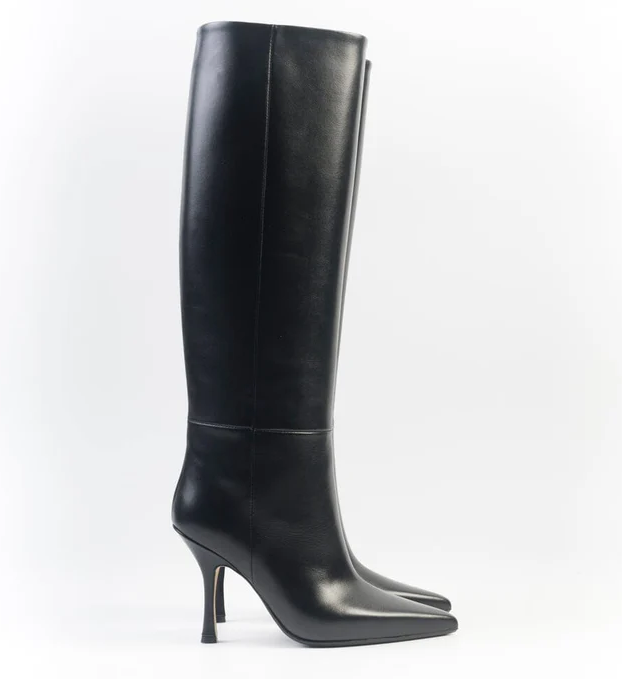 Stivale con forma a punta di Anna F, realizzato in morbido vitello di colore nero. Tacco stiletto, rivestito in pelle, di 10 centimetri. Gambale a tubo altezza di centimetri 43 circa (riferito alla misura 38)