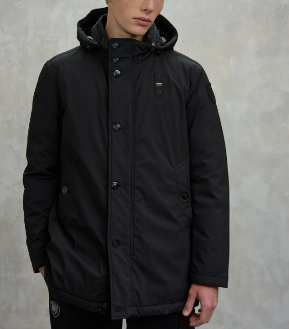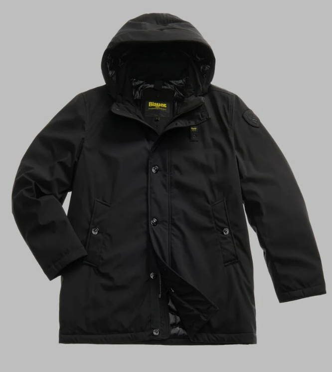 Parka lungo in neoprene liscio idrorepellente con collo alto removibile tramite zip. Imbottitura naturale calda ma non ingombrante. Capo iconico Blauer ad inspirazione militare.