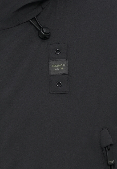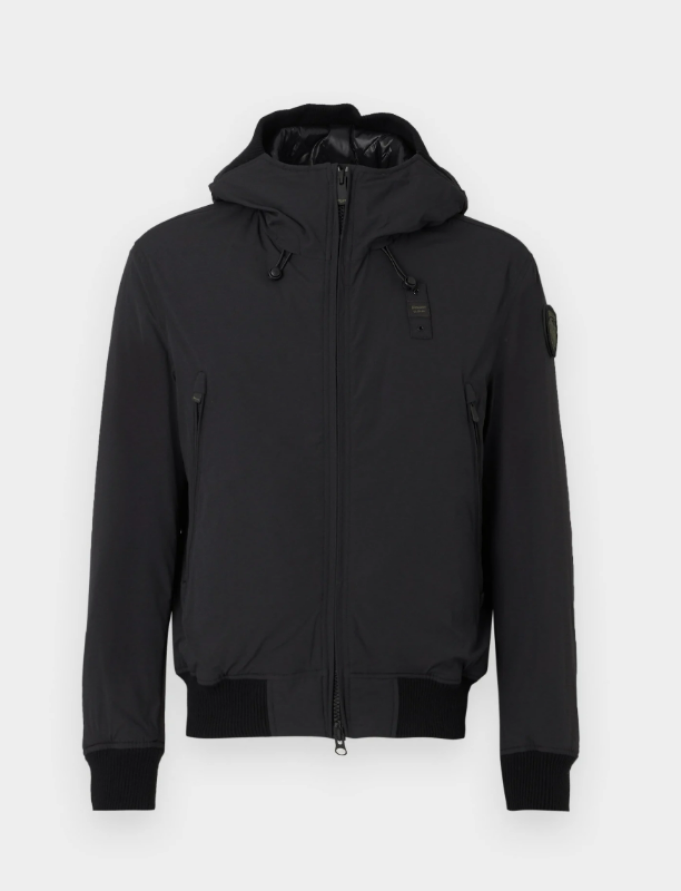 Giubbino in tessuto tecnico con orli elasticizzati a coste. Cappuccio fisso con coulisse, chiusura con zip, realizzato e foderato in nylon, imbottito ovatta Sorona® Aura, tasche con zip, tasca interna con velcro, patch logo con velcro e passante con logo.