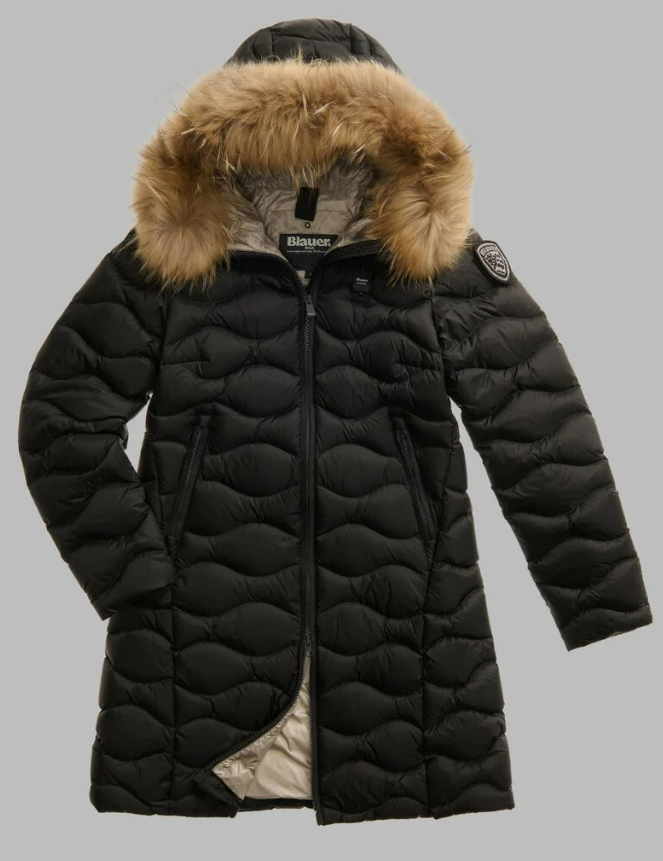 Piumino lungo trapuntato ad onde orizzontali con cappuccio fisso, profilo in vera pelliccia ed interno in contrasto colore. Capo donna con colori fashion e dal taglio che risalta il punto vita.