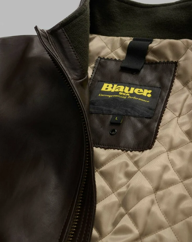 Giubbotto bomber in pelle con fodera leggera. Inserti elastici a costine su collo interno, polsini e orlo per una vestibilità aderente.
