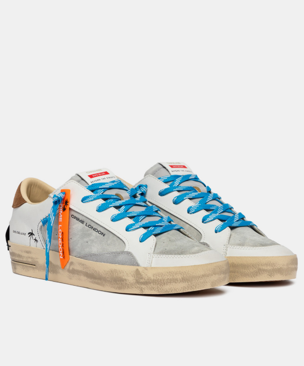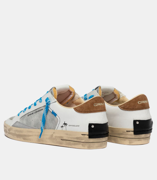 Sneaker realizzata con materiali di alta qualità. Tomaia in pelle e nabuck bianca e grigio, dettagli in lamina argento. Talloncino in nabuck cognac. Linguetta in tessuto grigio chiaro con label logata in pelle. Patch in pelle nera sul retro. Doppio laccio celeste e marshmallow
