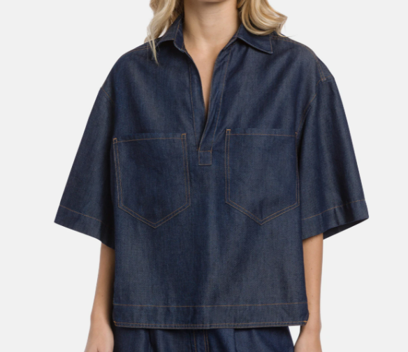 Camicia regular a maniche corte con scollo a polo e tasche applicate sul davanti. Denim fisso lyocell blu 9 oz. Lavaggio scuro pulito. Logo Dondup