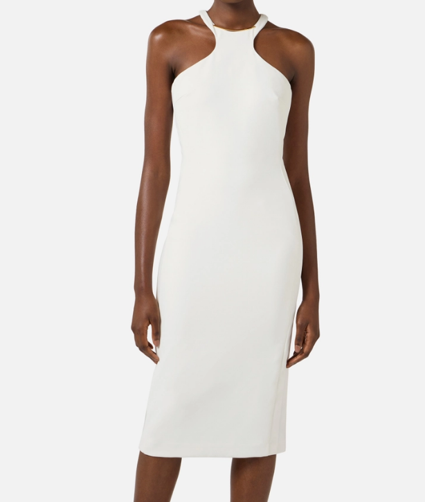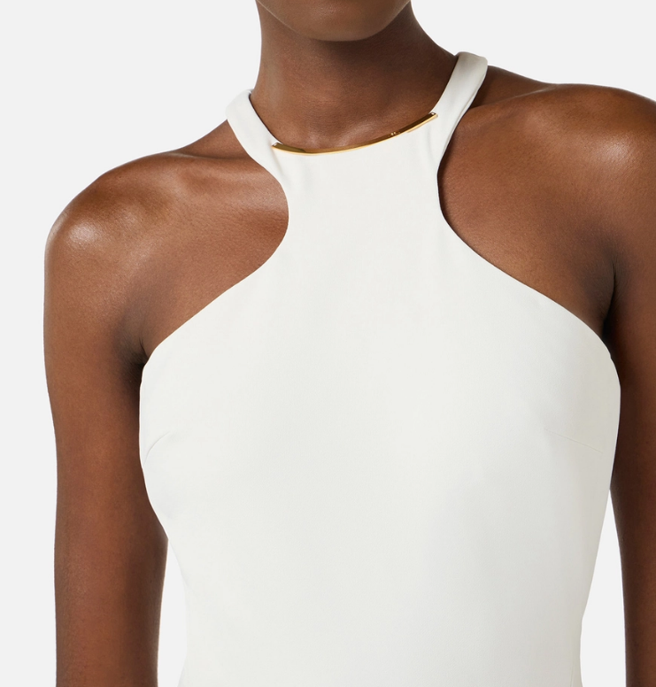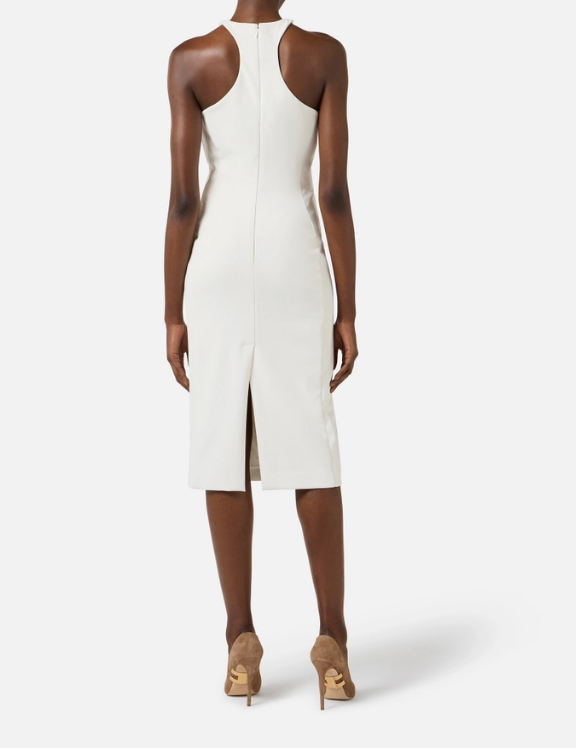 Abito in crêpe leggero dalla vestibilità aderente. Il vestito ha gonna midi e scollo olimpionico che mette in evidenza le spalle. Una placca in metallo dorato con logo lo impreziosisce sullo scollo.