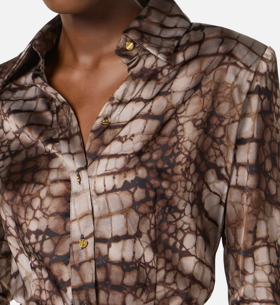 Camicia in raso con spalle strutturate a regalare una silhouette definita. Il capo ha colletto e maniche lunghe con polsini. Protagonista è la stampa all-over a tema alligatore, ispirata a forme e geometrie naturali. Vestibilità slim