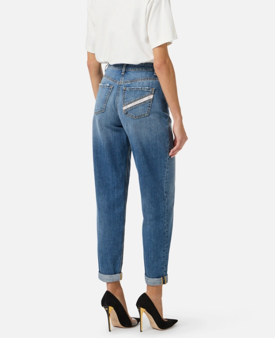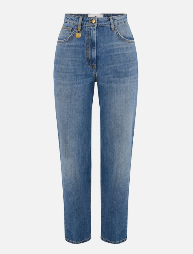 Pantaloni cinque tasche in denim con vita regolare e gamba a palloncino. Dai volumi insoliti, sono impreziositi da un ciondolo a forma di lucchetto con passante. Tasche posteriori, una delle quali decorata con un nastro diagonale con logo. Vestibilità regolare.