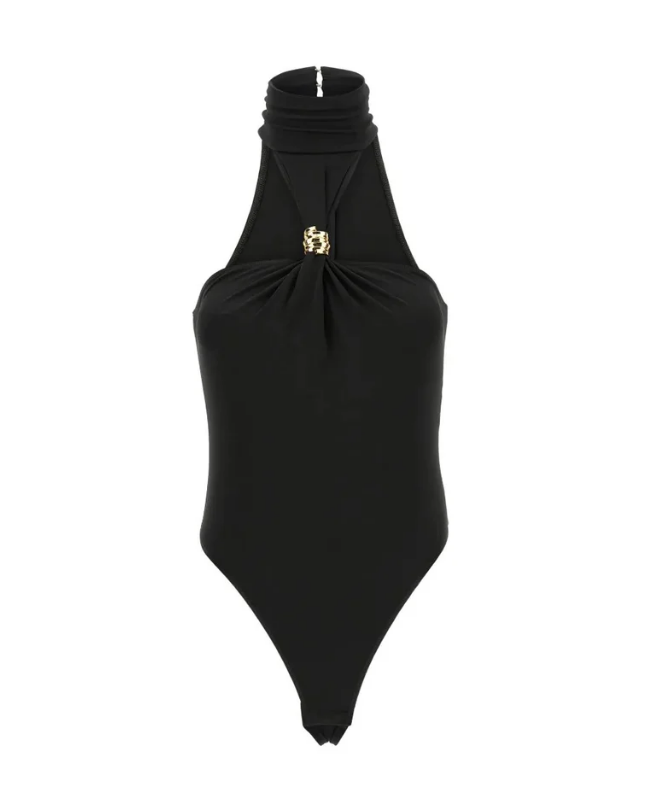 Body in jersey crêpe con collo alto. Il capo è impreziosito da un accessorio gioiello in metallo dorato che tiene insieme lo scollo. Vestibilità slim