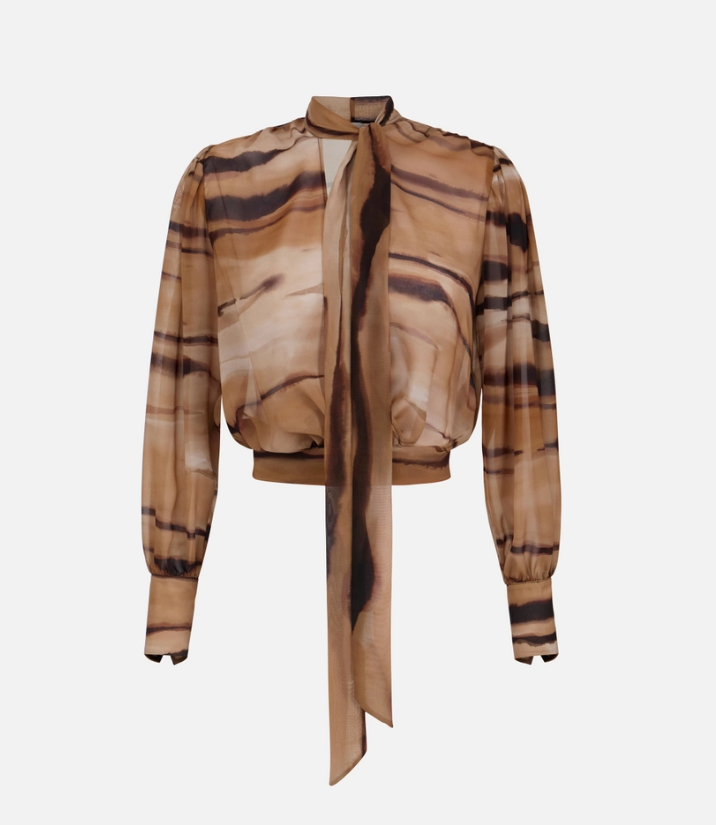 Blusa in tessuto chiffon. Presenta fusciacca che dona leggerezza, posizionata sullo scollo e in vita sulla schiena. Protagonista è la stampa tigre all-over, ispirata ai colori e ai motivi naturali. Bottoni in metallo dorato rifiniscono il capo. Vestibilità regolare