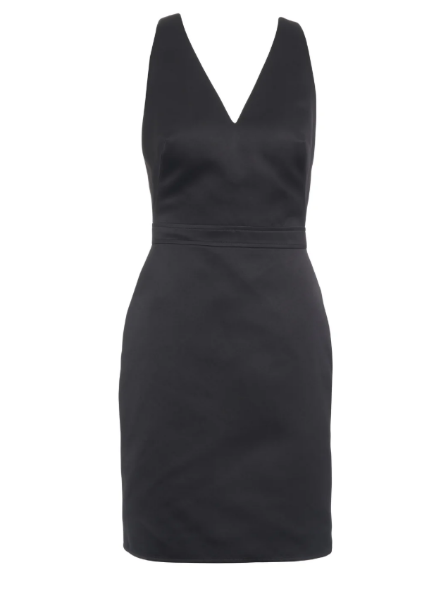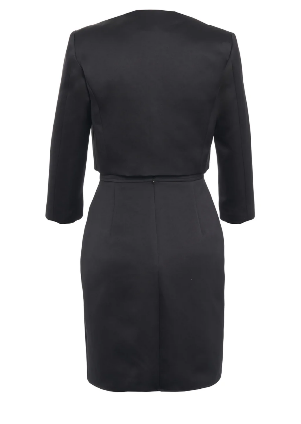Abito in duchesse. Il vestito è smanicato con scollo a V. Sorprende il retro in tulle che lascia intravvedere la schiena e crea raffinate trasparenze. La giacca abbinata ha spalle strutturate e tagli sagomati che disegnano la figura, al fondo dettagli con logo ricamati in filo e in tono. Vestibilità regular