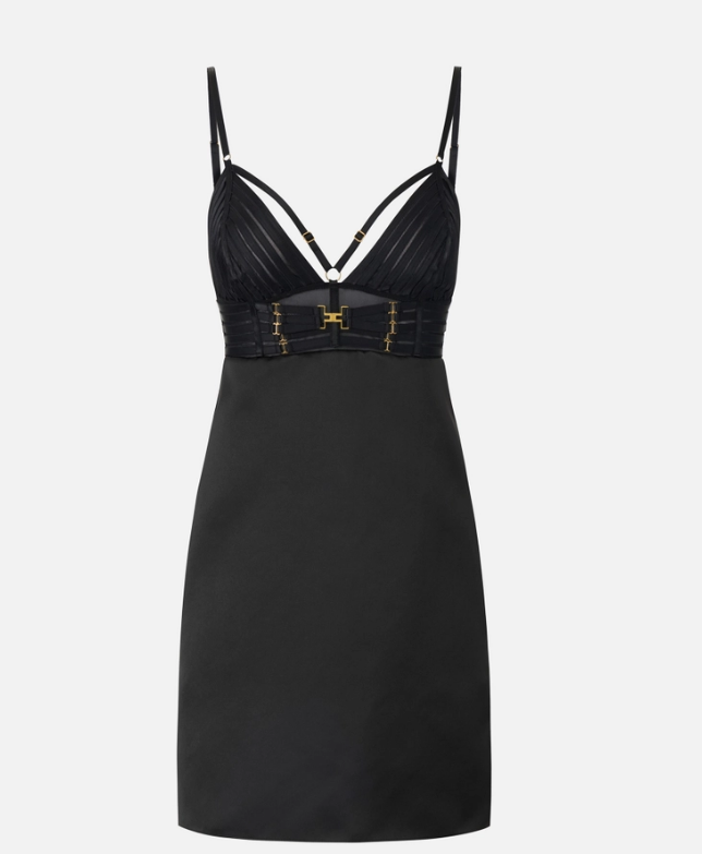 Mini abito in duchesse. Il vestito ha spalline sottili e si distingue per il busto arricchito da elastici di ispirazione lingerie, ricamati sulle coppe e sul busto. A completare, un dettaglio in metallo dorato con logo. Vestibilità regular