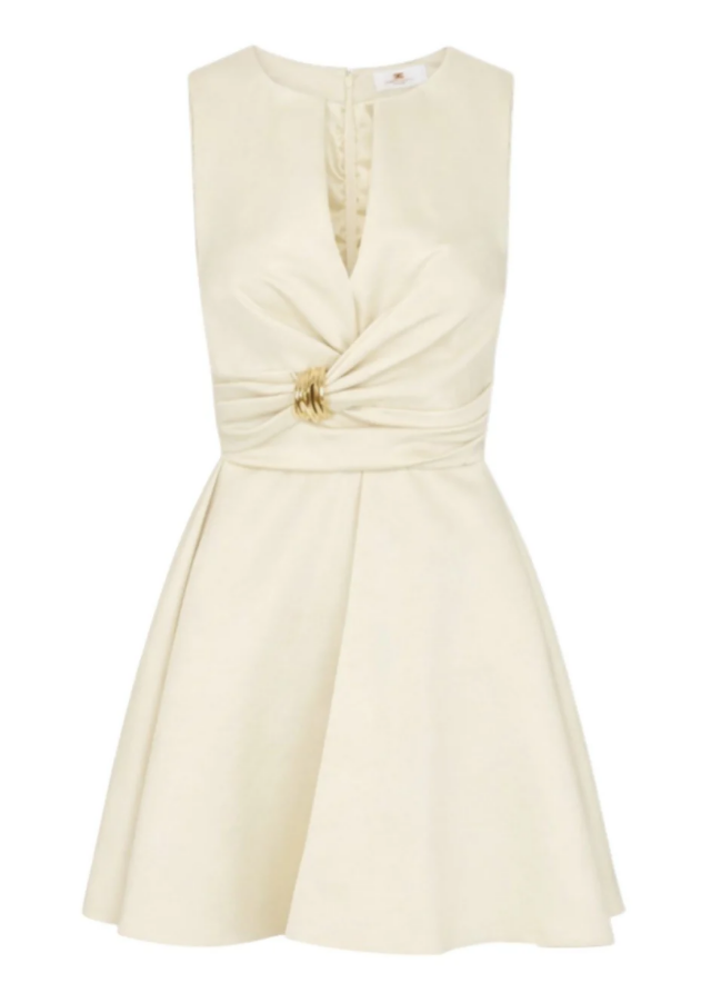 Abito in raso duchesse dalla vestibilità regolare. L'abito senza maniche ha una scollatura a girocollo con taglio a V. Si distingue per il drappeggio che delinea i fianchi con linee morbide, impreziosito da una chiusura gioiello in metallo dorato che crea una raffinata brillantezza. Dettaglio con logo su un lato
