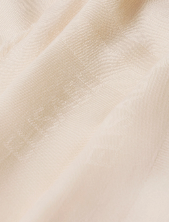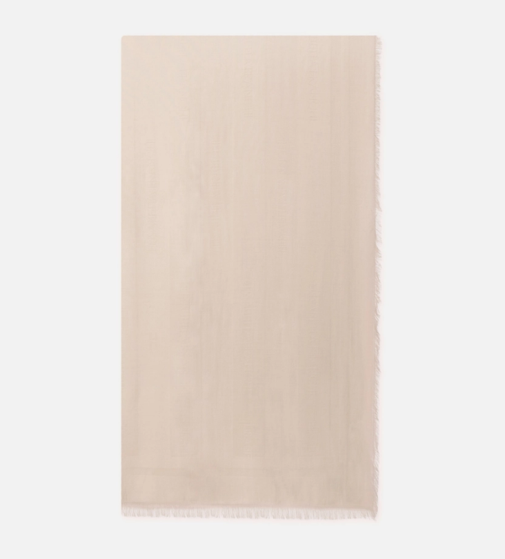 Foulard rettangolare in viscosa e modal tinto in capo. Si distingue per la fantasia a righe con logo, che dona movimento all'accessorio. Montatura in tinta unita con bordi sfrangiati
