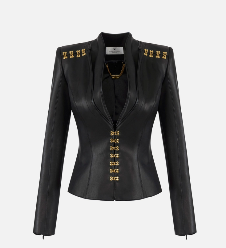Giacca realizzata in materiale sintetico effetto nappa. Ha spalle strutturate e rever sagomato che crea particolari effetti di bordatura, esaltati da dettagli di piping e dalla costruzione a bustier che scolpisce la silhouette. I ganci in metallo dorato illuminano spalle e busto. Vestibilità slim.